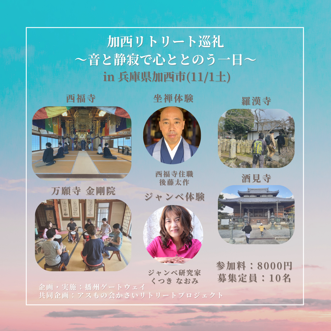 11/1(土)に加西市で開催予定のツアー「かさいリトリート巡礼 ~音と静寂で心ととのう一日~」に加西市より後援を頂きました。