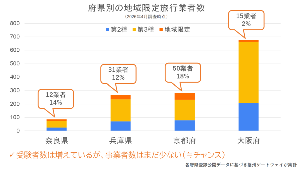 ちなみに、第二種、第三種と並んで地域限定旅行業者の登録数は都道府県のホームページで公開されているのですが、そのデータをもとに、兵庫県、大阪府、京都府、奈良県で地域限定旅行業者の数を集計すると下のグラフのようになりました。府県によって偏りがあることがわかります。
